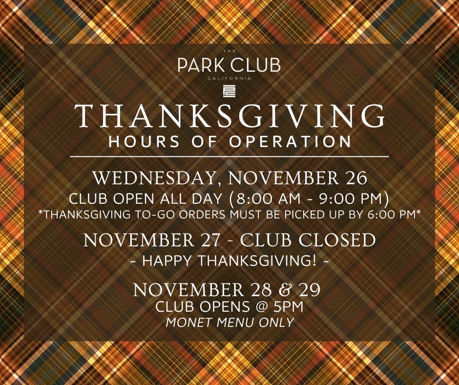THANKSGIVING HOURS OF OPERATION: Wednesday, November 26 – Club open all day (8:00 am – 9:00 pm) Thanksgiving...