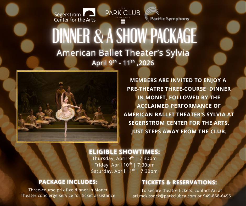 Park Club Members are invited to enjoy a pre-concert three-course dinner in Monet, followed by the acclaimed performance of American Ballet Theater's Sylvia at Segerstrom Center For The Arts, just steps away from the Club. Members are encouraged to utilize the Club's theater concierge* to secure your tickets and book your reservation!