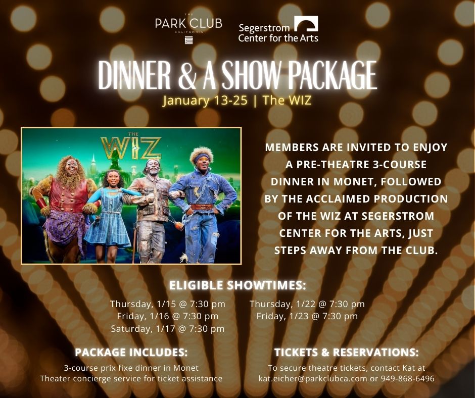Park Club Members are invited to enjoy a pre-theatre 3-course dinner in Monet, followed by the acclaimed production of The Wiz at Segerstrom Center for the Arts, just steps away from the Club. Members are encouraged to utilize the Club's theater concierge* to secure your tickets and book your reservation!