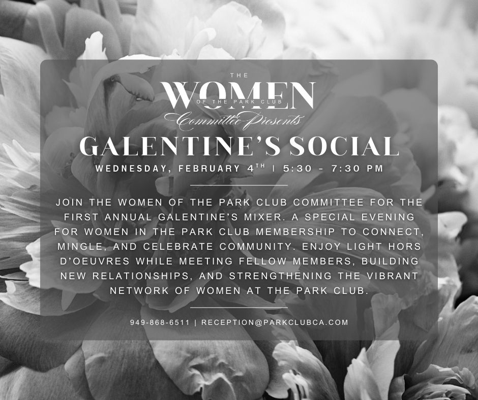 Join the Women of The Park Club Committee for the first annual Galentine’s Mixer. a special evening for women in the park club membership to connect, mingle, and celebrate community. Enjoy light hors d’oeuvres while meeting fellow members, building new relationships, and strengthening the vibrant network of women at The Park Club.