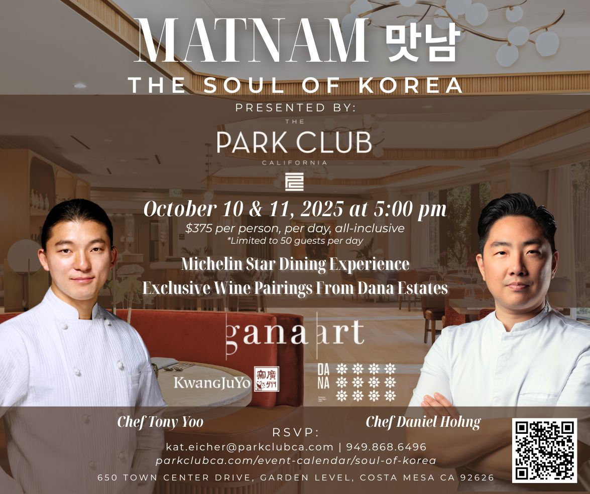 RSVP to experience an unforgettable Michelin-starred evening at The Park Club. This two-day cultural celebration features curated highlights from Gana Art, exclusive wine pairings from Dana Estates, and a few extraordinary surprises, each night offering a singular, immersive experience.