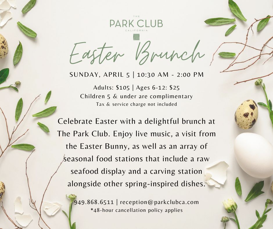 Celebrate Easter with a delightful brunch at The Park Club. Enjoy live music, a visit from the Easter Bunny, as well as an array of seasonal food stations that include a raw seafood display and a carving station alongside other spring-inspired dishes. *48-hour cancellation policy